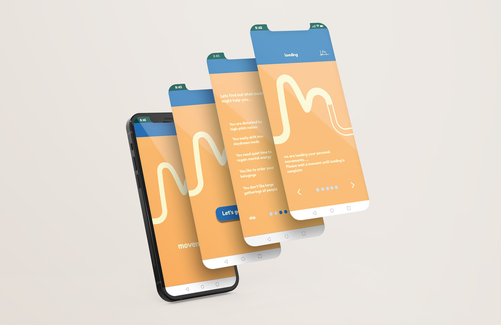 Brand development and app design for Movement. An app aimed at children, who through specific movements can overcome various learning and development setbacks.